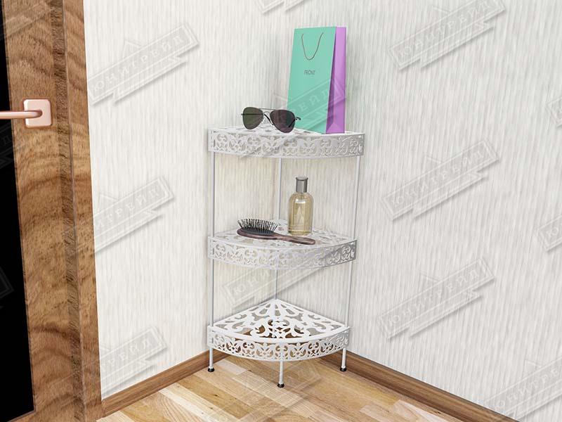 Угловая 3х-ярусная этажерка для прихожей, (металлическая, сборная, ажурная с элементами лазерной резки). Очень удобна для хранения мелочей, часто используется как подставка для цветов в горшках так и в помещениях, где есть небольшие углы или выступы.