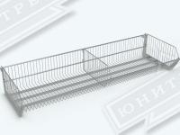 1 длинный стеллаж с продукцией. Данный тип корзин используют для выкладки товаров в магазинах продуктов и одежы. За счет жесткого пластинчатого каркаса (состоит из полос, на которые крепятся корзины) выдерживает больший вес.