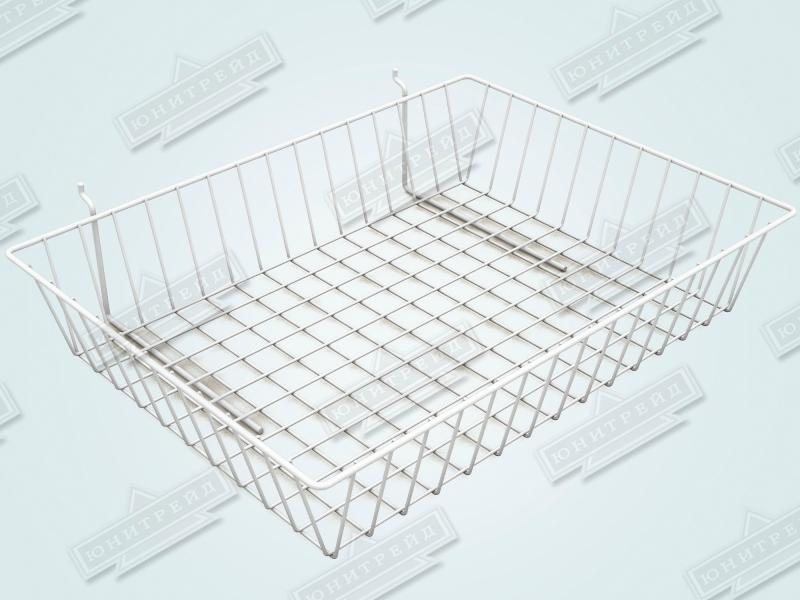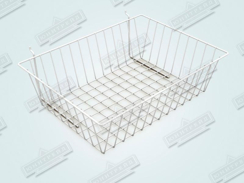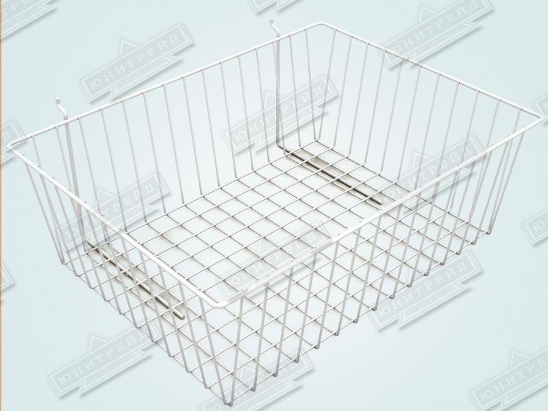 Сетчатая корзина на перфорацию сделана из металлической проволоки. Подойдет для комплектации магазинов одежды, нижнего белья, товаров для дома.