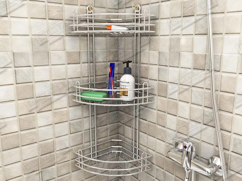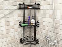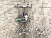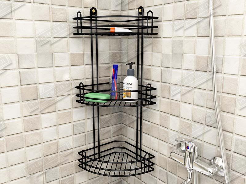 Металлическая навесная угловая полка в ванную комнату сделана из проволки. Состоит из 3-х ярусов. Предназначена для хранения шампуней и других мелочей. Крепится на саморезы (идут в комплекте).
