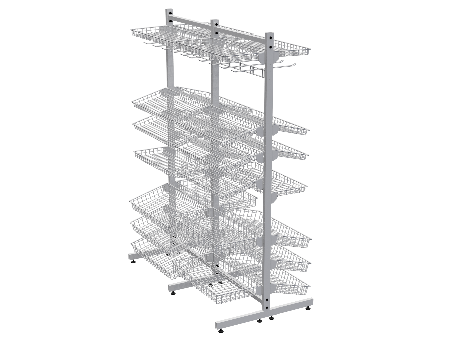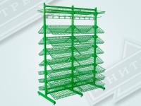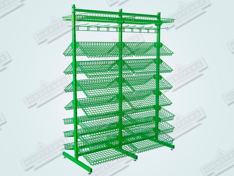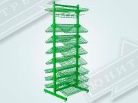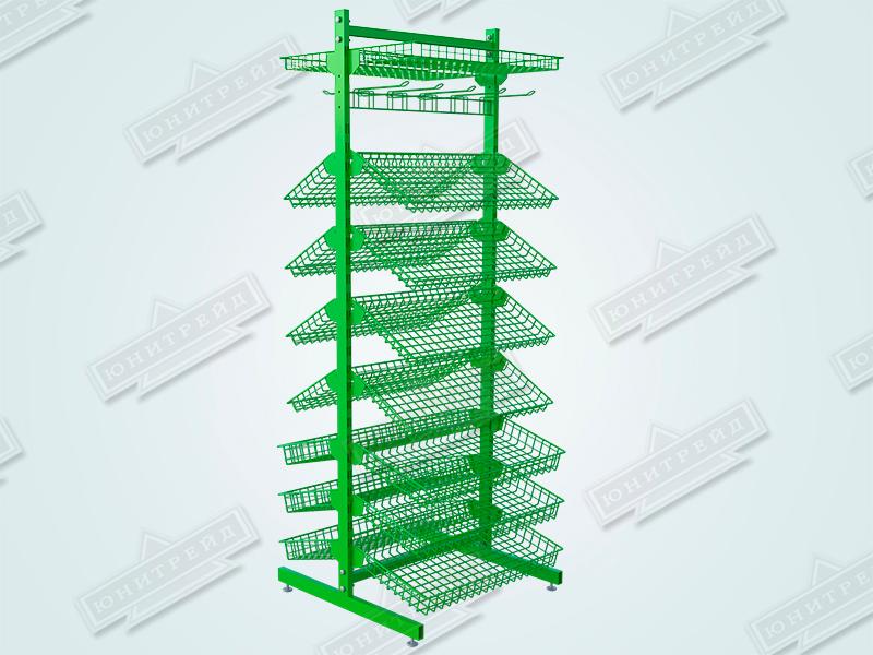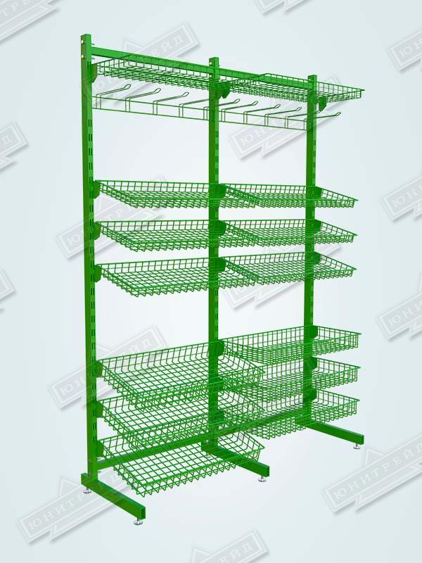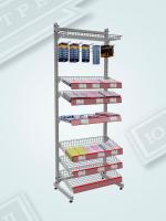 Это торговое оборудование можно разместить в прикассовой зоне или произвольно в торговом зале. Стеллаж может состоять из одной ,двух и более секций. Корзины могут располагаться с обеих сторон. Для компактных торговых точек подойдёт односекционная сборка. Для увеличить торговой площади, можно собрать двухсекционную конструкцию. Особую ценность представляет возможность создания островных решений: односекционной двусторонней стойки для центральных зон торгового зала и двухсекционной двусторонней конфигурации для максимально эффективного использования пространства. Стойки с двухсторонней перфорацией докупаются отдельно.