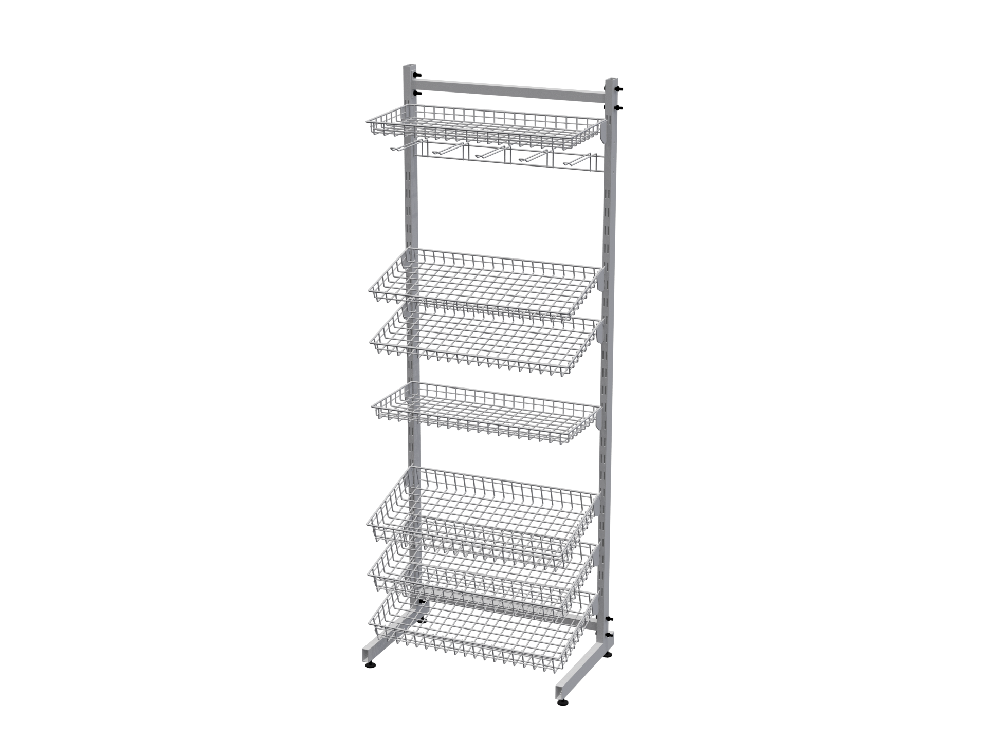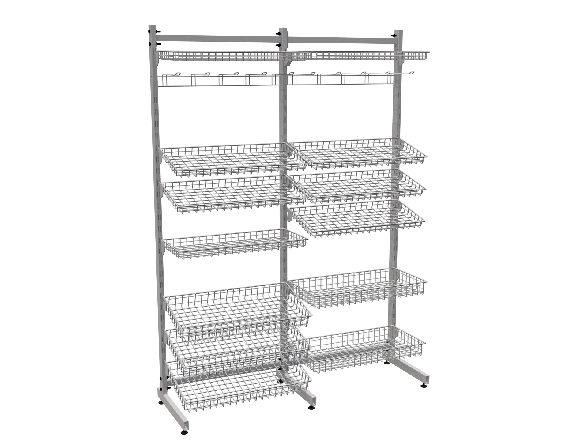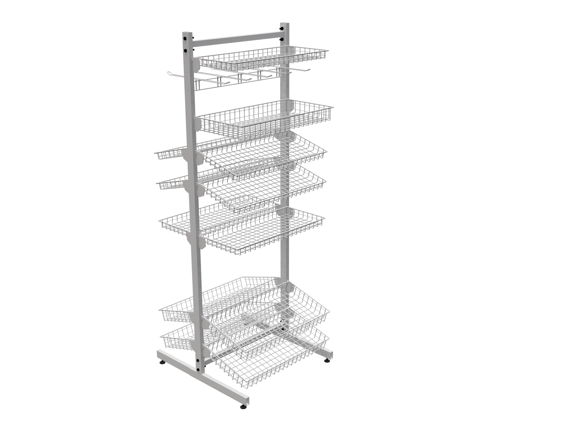 Это торговое оборудование можно разместить в прикассовой зоне или произвольно в торговом зале. Стеллаж может состоять из одной ,двух и более секций. Корзины могут располагаться с обеих сторон. Для компактных торговых точек подойдёт односекционная сборка. Для увеличить торговой площади, можно собрать двухсекционную конструкцию. Особую ценность представляет возможность создания островных решений: односекционной двусторонней стойки для центральных зон торгового зала и двухсекционной двусторонней конфигурации для максимально эффективного использования пространства. Стойки с двухсторонней перфорацией докупаются отдельно.