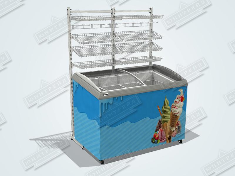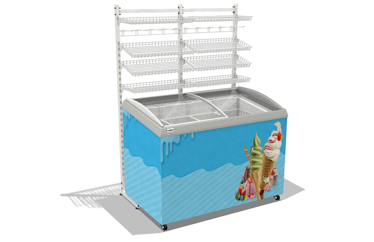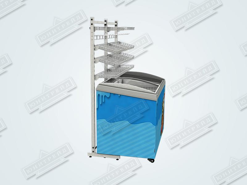 Стойка может быть использована в качестве суперструктуры и устанавливается между морозильными ларями с одной или двух сторон.