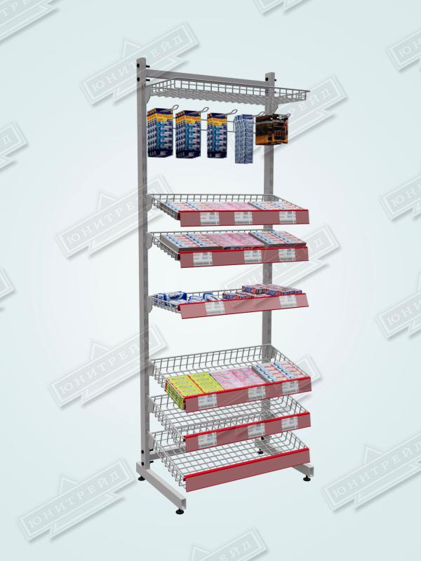 04.08.008.00.15.7016.01 | Стойка прикассовая односторонняя, односекционная (СП1612К1) | 3 глубоких корзины + 5 мелких корзин + 1 подвес с крючками | 606,5х400х1679 | пп |