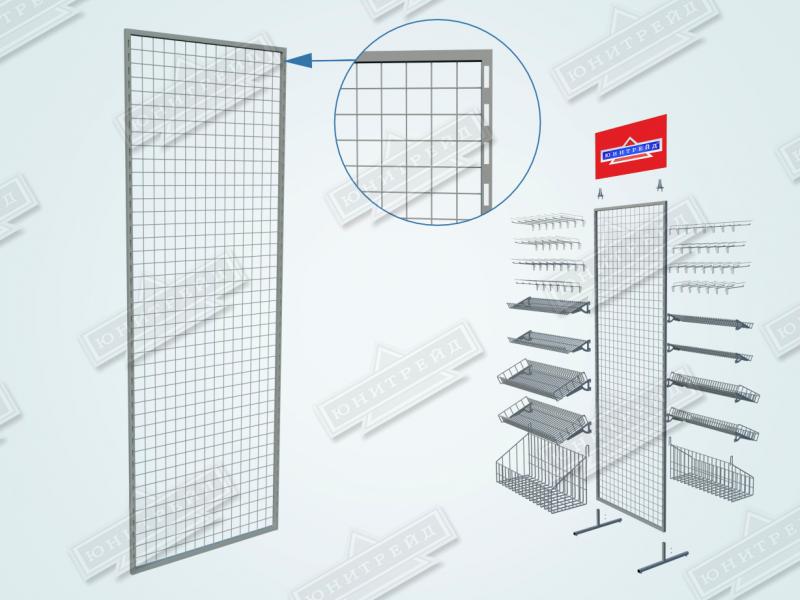 Стенд может компектоваться навесными корзинами на сетку , так и полками и корзинами на кронштейнах. Также решетка может устанавливаться на ножках или крепиться к стене. Большой выбор аксессуаров обеспечивает создание собственной уникальной конфигурации стенда.