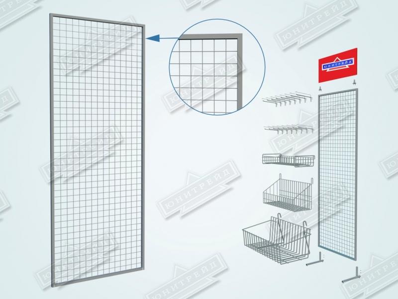 Сетчатый стенд может компектоваться навесными корзинами на сетку. Также решетка может устанавливаться на ножках или крепиться к стене.