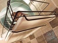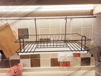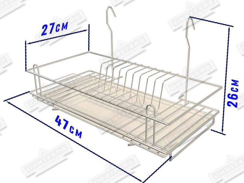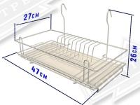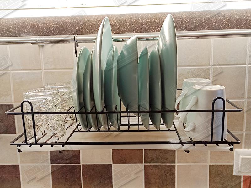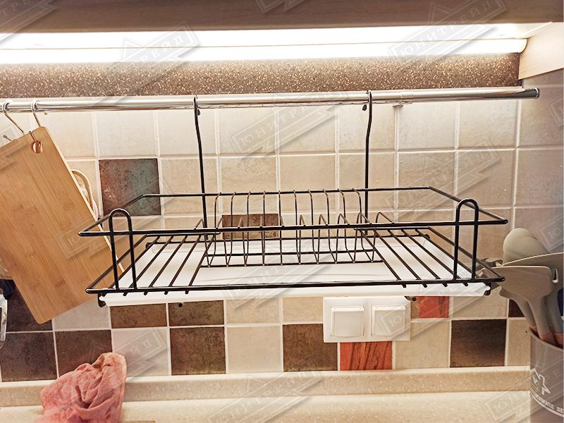 Тарелосушку - сушилку для посуды, можно разместить на рейлинг в кухне для хранения тарелок, кружек, чашек, маленьких досок и крышек. Навесная сушка для посуды с поддоном - одноярусная имеет 2 больших кармана для хранения стаканов и столовых приборов (ножей, вилок, ложек). Держатель (подставка для посуды) - изготовлена из металлической проволоки.