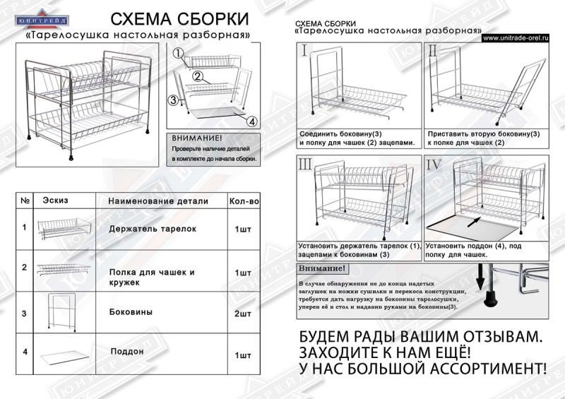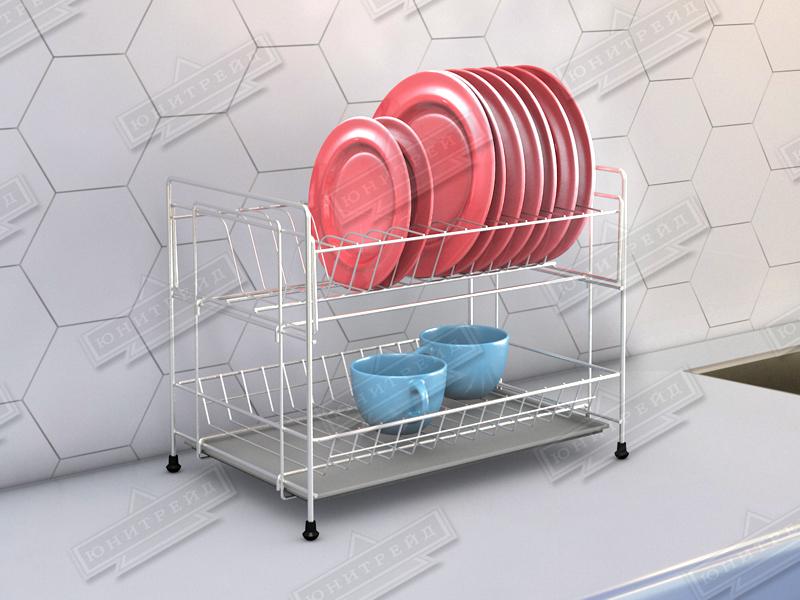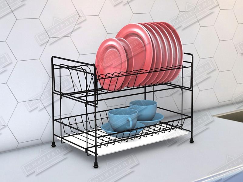 Настольная тарелосушка гармонично впишется в вашу кухню создаст уют в доме и на кухне. Разборная сушилка для посуды удобна в перевозке, компактно складывается для транспортировки на дачу или в путешествие. Она быстро собирается и разбирается , удобна, мобильна, легка в сборке . Органайзер имеет две полки для сушки тарелок и крышек для кастрюль, а нижний ярус предназначен для сушки столовых приборов, чашек, кружек, бокалов, ложек, вилок. Посудосушитель часто располагают над раковиной в шкафу, для хранения посуды. Сушка комплектуется белыи или черным поддоном. Складная посудосушка имеет торцевые пластиковые заглушки на ножках, чтобы не царапать столешницу кухи.