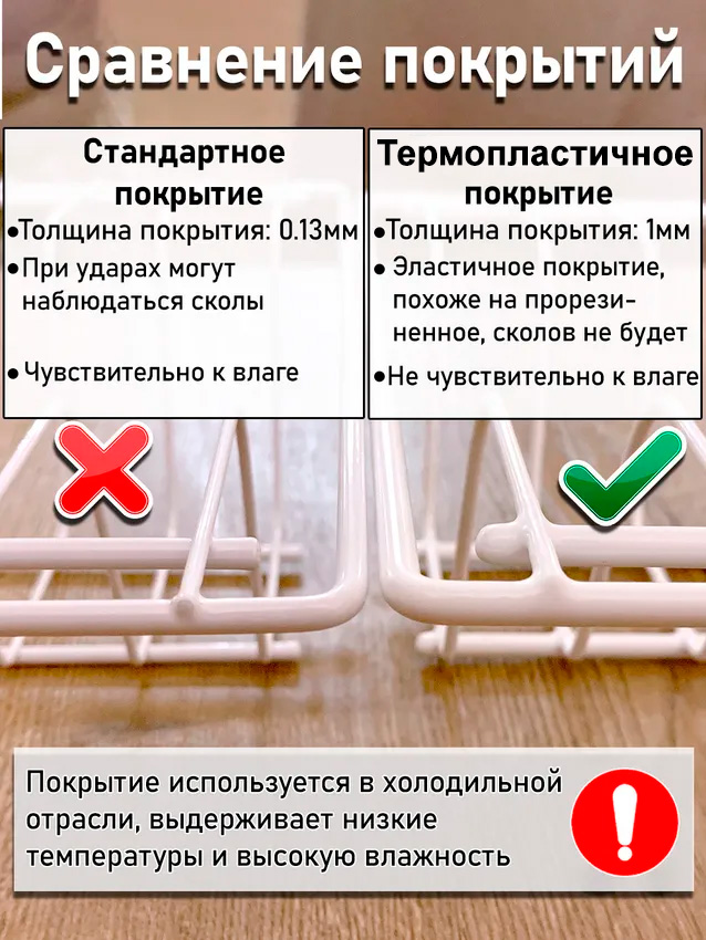 Изделия устойчивы к воздействию рабочей среды, для которой характерны, как правило, высокая влажность и постоянная пониженная температура. Мы с особым вниманием относимся к качеству покрытия холодильных корзин. Вот почему наши специалисты осуществляют строгий контроль качества на каждом этапе производства изделия. Важна предпрокрасочная подготовка холодильной корзины, а именно ее обезжировка и фосфатирование, которые обеспечивают максимальную адгезию краски с металлической поверхностью.