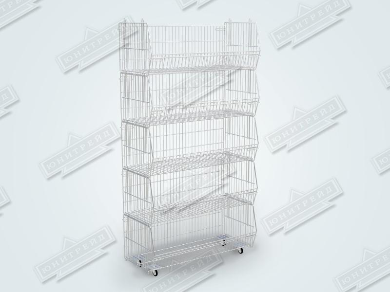 Металлический стеллаж представляет собой практичную торговую конструкцию разборного типа, состоящую из пяти сетчатых корзин, установленных друг на друга. Изделие выполнено из оцинкованного металла, что обеспечивает его долговечность и устойчивость к коррозии.