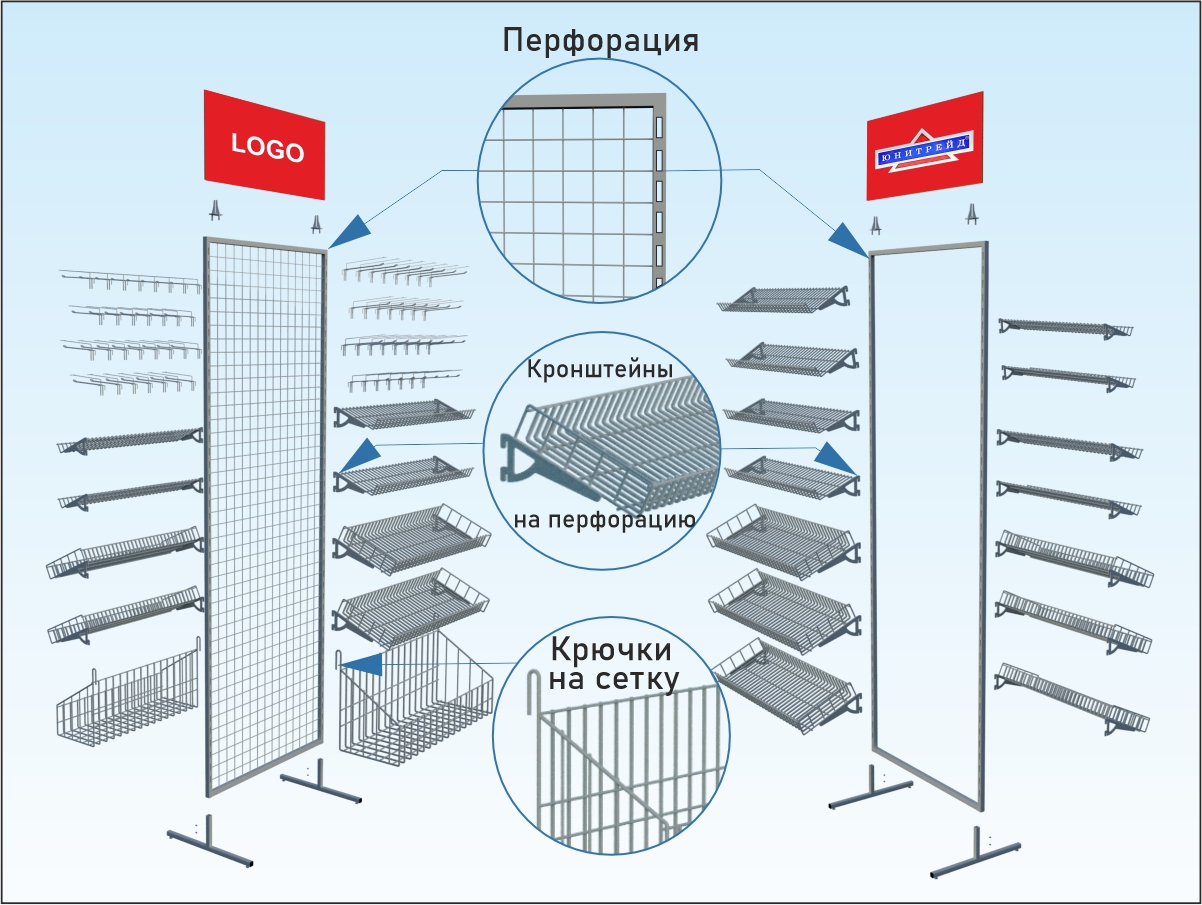 Универсальные модульные стенды с перфорацией под кронштейны и на сетку.