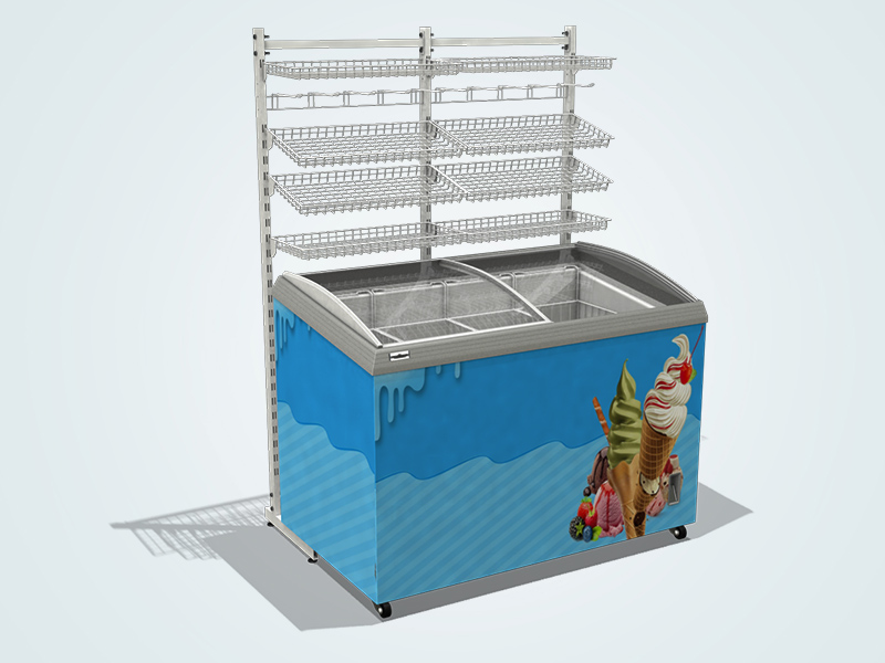 Данная стойка может быть использована в качестве суперструктуры и устанавливается между морозильными ларями с одной или двух сторон в зависимости от проходимости и расположения касс. Данные секции доукомплектовываются , как правило, 3-мя верхними корзинами и крючками. По желанию заказчика комплектация прикассовой стойки может быть изменена.