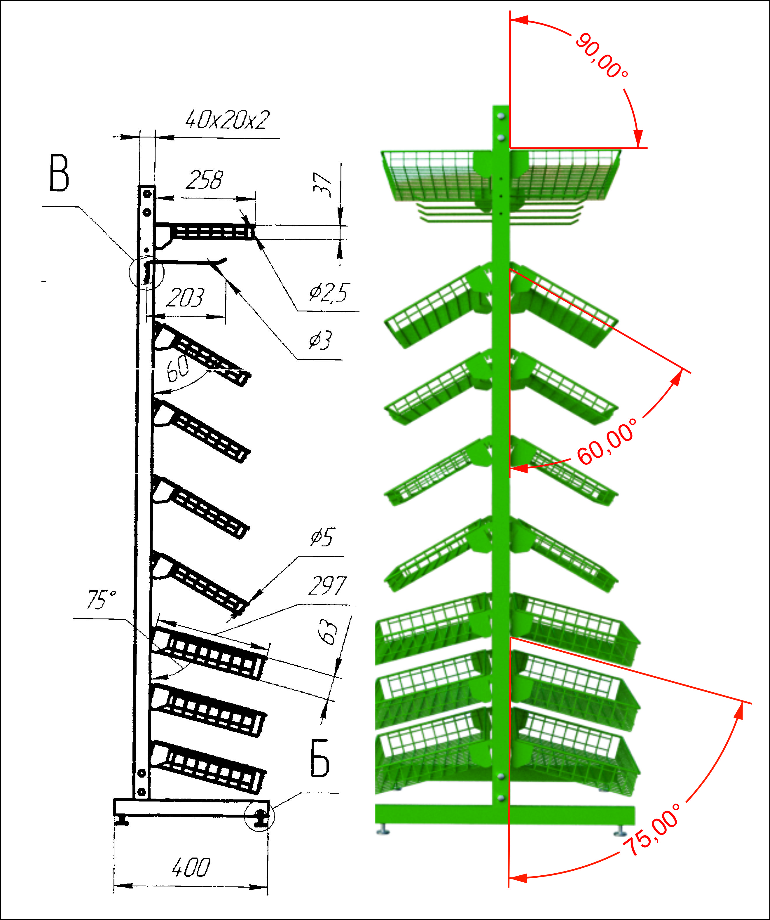 Корзины имеют удобные кронштейны, которые позволяют регулировать угол наклона в 60°,75°, 90° градусов. Комплектация стойки по количеству навесных элементов может быть изменена по желанию заказчика.